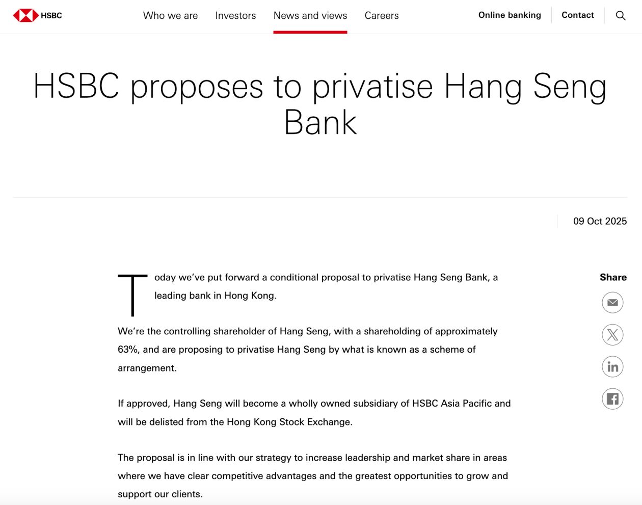 【环球网财经报道 记者 谭雅文】日前,一笔超千亿港元的私有化交易计划,引发国际金融界关注。10月9日,汇丰控股发布公告对外宣布,拟以协议安排方式将恒生银行私有化。根据方案,汇丰将以每股155港元的价格,收购其未持有的约36.65%恒生银行股份,总作价达1061.56亿港元。