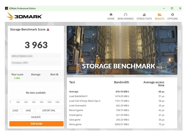 更值得一提的是,作为一款DRAMLess产品,AM6D1仍具备出色的稳态性能。3DMark测试显示,在75%填盘状态下,其读写性能保持高度稳定,波动极小,整体评分达3963分,接近空盘表现。这意味着即便长期使用、存储空间趋于饱和,用户依然可获近乎空盘的流畅体验,无需担忧掉速问题。