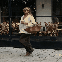 搭配白色衬衫和水洗牛仔裤,一件干练利落的巧克力棕色夹克外套,墨镜点缀,承包整一个秋季,时髦干练,尽显好气质。