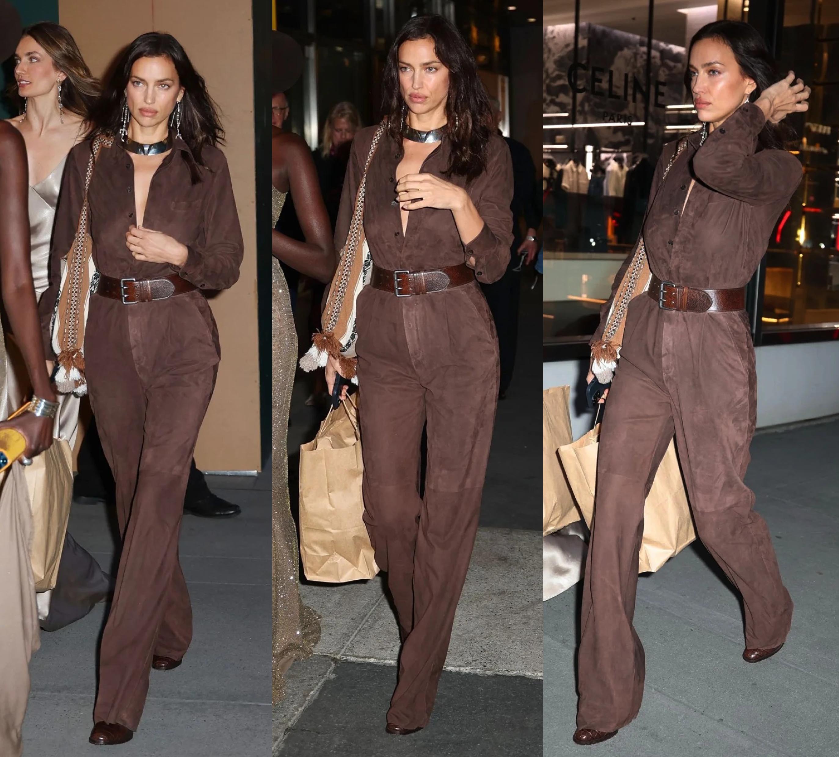 在参加完Ralph Lauren 2024秋季假日系列的维密超模伊莲娜(Irina Shayk),同样是身穿一袭巧克力棕色系连体装离开了时装的秀场,搭配同样巧克力棕色系的皮革靴,眼神坚定不羁,又酷又飒,如同T台上的那颗闪耀的光芒,气场全开。