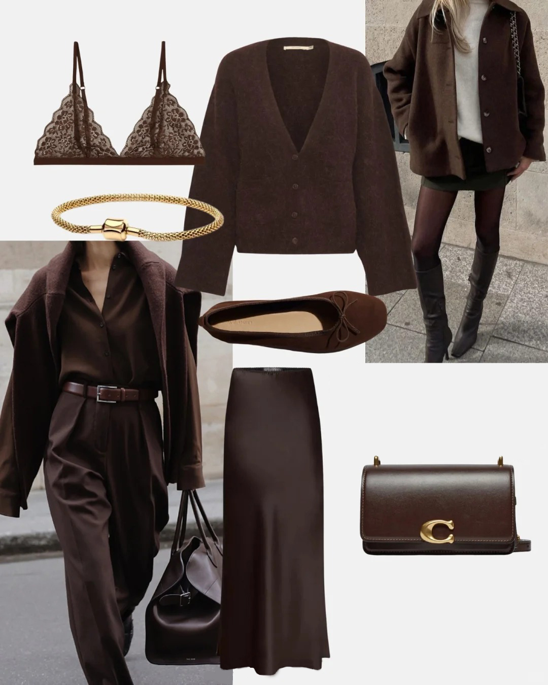 醇厚的色调,浓郁的魅力,让这一股浓情巧克力的棕色系在2024年秋冬之季掀起一阵又一阵的热浪。在每一个穿衣搭配的小细节里见缝插针,从贴身的内衣到地面行走的鞋子,还有那精致的手袋和皮带,如同秋天的微风,用一种温暖含蓄而内敛的力度,悄然登场,开启时髦之秋最IN的气色,美得毫不费力。