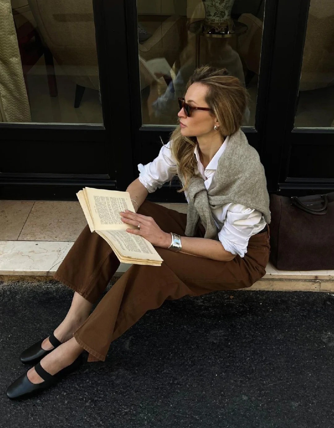 悠闲惬意,搭配一件浅灰色毛衣,披在肩膀上加以点缀,这一组高级的段位想挡都挡不住~!
