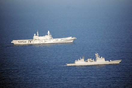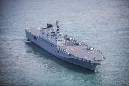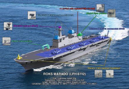 图1和图2是韩国海军“忠武公李舜臣级”导弹驱逐舰5号舰“姜邯赞”号驱逐舰同可以起降F-35B战斗机的轻型航母编队航行,韩国在第二艘独岛级就研究过收纳F-35B的可能性,但由于会拖延计划而放弃。此次新型航母将第三艘放大一倍到3万吨,以容纳16架F-35B并加装滑跳甲板,但保留可容纳20辆两栖登陆车的船坞。图3至图6为韩国海军第二艘独岛级两栖攻击舰“马罗岛”号(LPH-6112)