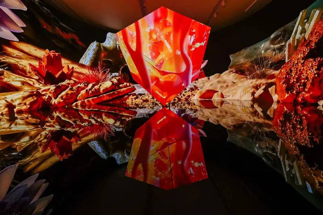在“艺术未来式”展区,这种“为艺术量身定制”的思路体现得淋漓尽致。 费俊的《生命花园·生命之花》需要营造“被生命包裹”的沉浸感,京东方用24米巨幅柔性LED屏打造环形沉浸空间,配合高清魔方屏形成的裸眼3D视觉,让数字生命体仿佛从屏中生长而出,将观众温柔包裹;夸尤拉的《夏日花园》致敬莫奈印象派,需要极致还原笔触的细腻肌理,京东方用超高清 MLED巨幕,让每一处光影层次都纤毫毕现;Liam Young的《伟大的事业》使用小间距MLED产品,组成一个超高清8k影院空间,沉浸式地向观众传达保护生态的理念。《地心回响》则打破了常规展示的局限,京东方用地屏实现向下的空间交互,让观众不再只是“看”历史,而是真正“走进”历史。