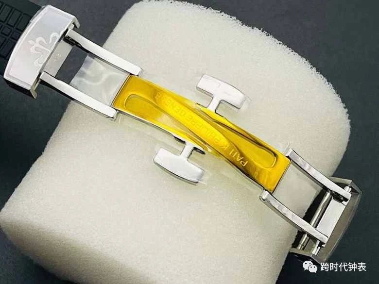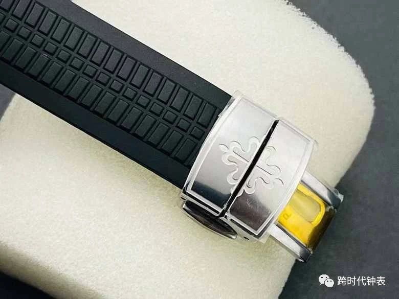搭配「Tropical」复合材质表带,展现独特的设计与质感,钢制Aquanaut折迭扣饰以百达翡丽著名卡勒卓华十字星压花图案,更是素质的象征。