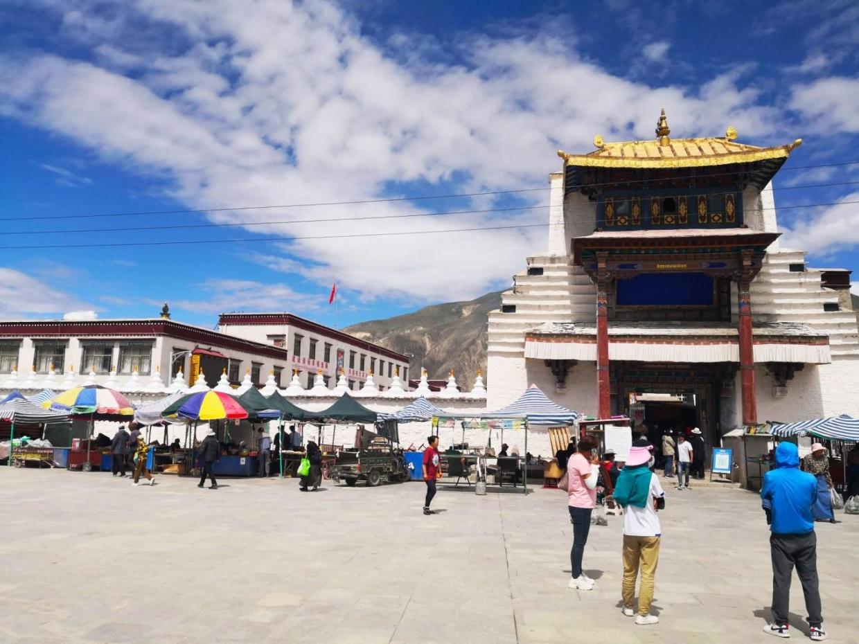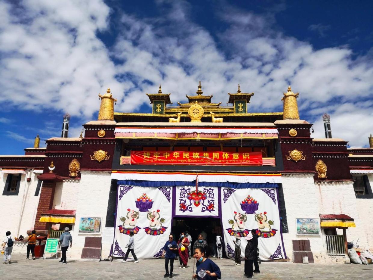 走出桑耶寺大门,此刻的阳光炙烈,进进出出的凡人去寺庙膜拜神佛