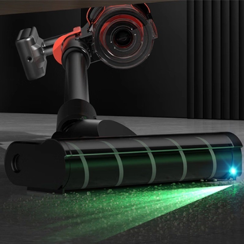 德尔玛 T50搭载广角绿光显尘技术,地刷前端 LED 光源可清晰照亮地面微尘,即使在床底、沙发底等暗光区域,猫毛、碎屑等细小颗粒也能一目了然,避免漏扫,让清洁过程更直观高效,尤其适合对灰尘敏感的养宠家庭精准捕捉污渍。