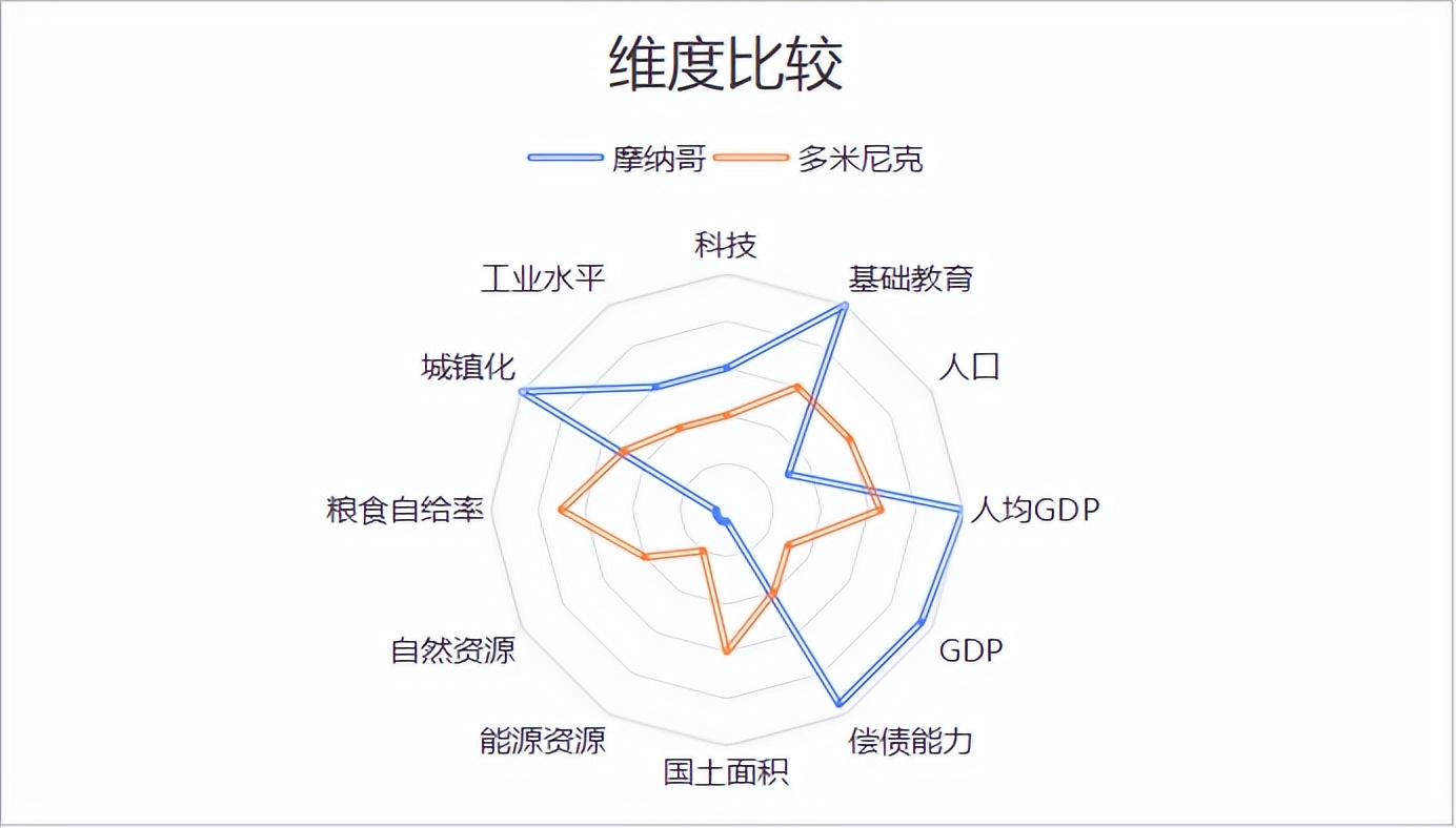 以下是摩纳哥与多米尼克的维度比较图,那五项短板是袖珍国家的共性。