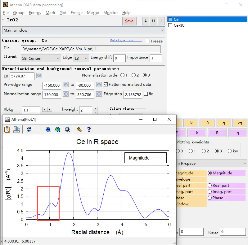 然后选择窗口范围,因为Ce-L3的EXAFS数据本来就短,所以窗口尽量全部覆盖住。