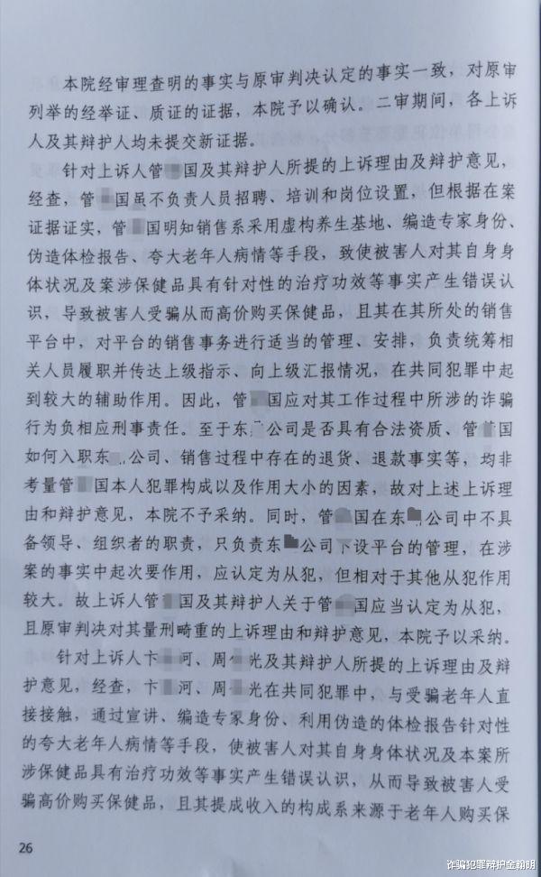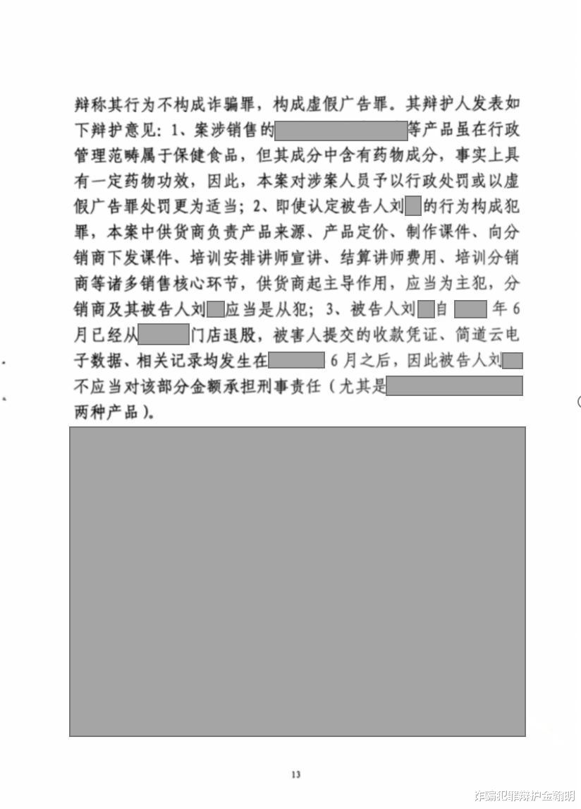 本案我们围绕涉案公司系证照齐全、有保健品销售资质的合法主体;涉案公司销售的保健品是三证齐全、正规厂家生产的合格产品;本案不存在冒充专家、医生的行为,没有承诺治疗、治愈、根治疾病等辩护要点,提出不能将夸大宣传等同于虚构事实、隐瞒真相的诈骗行为。本案我们以无罪辩护为手段,以争取当事人轻判为目的,最终促使法院减轻处罚,大幅降低当事人的刑期,最终判罚5年。法院虽基于多方考虑,未能改变诈骗罪定性,但亦认可案件定性上存在一定争议,最终折中处理,在量刑时予以了考量,全案当事人均获轻判。