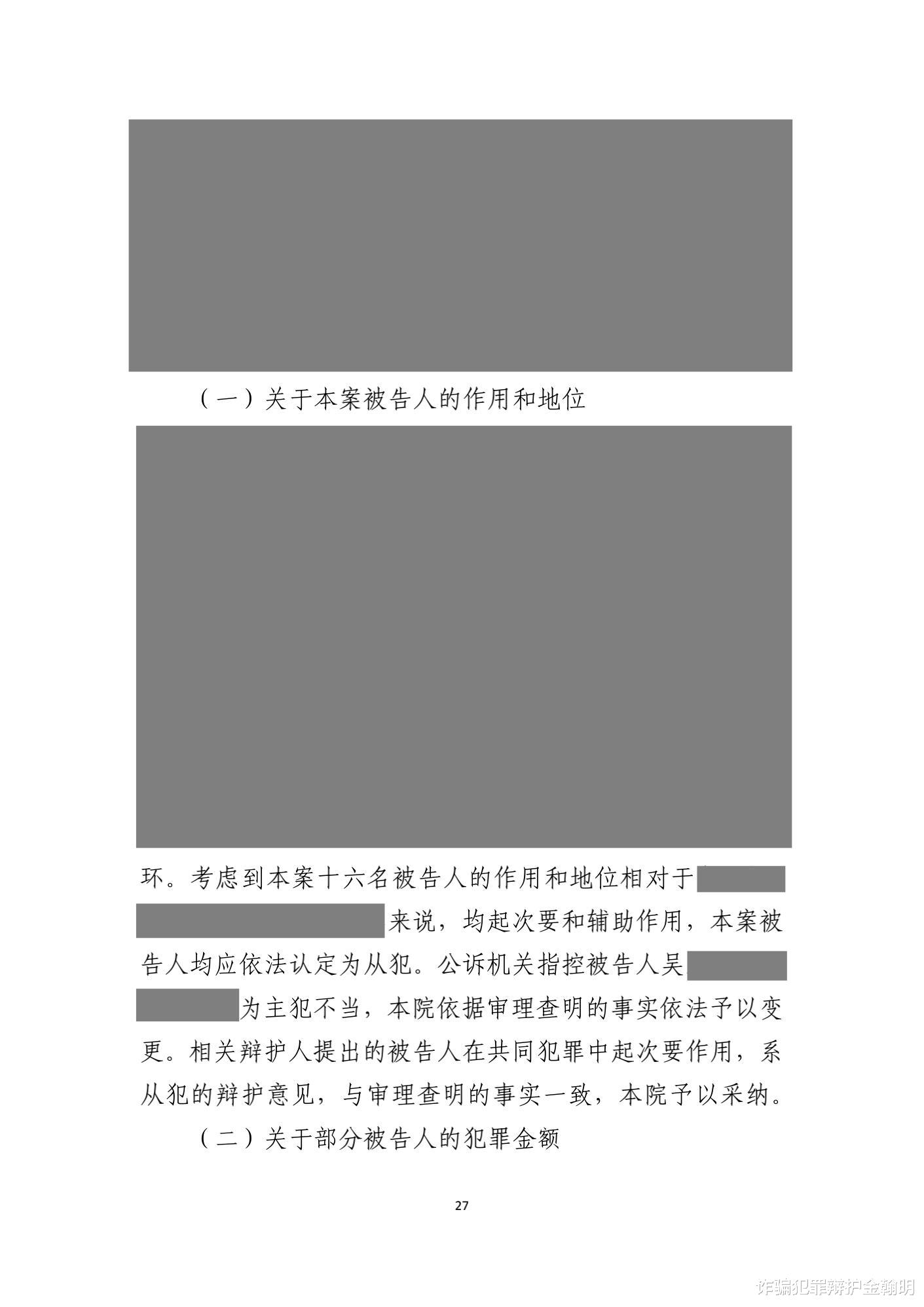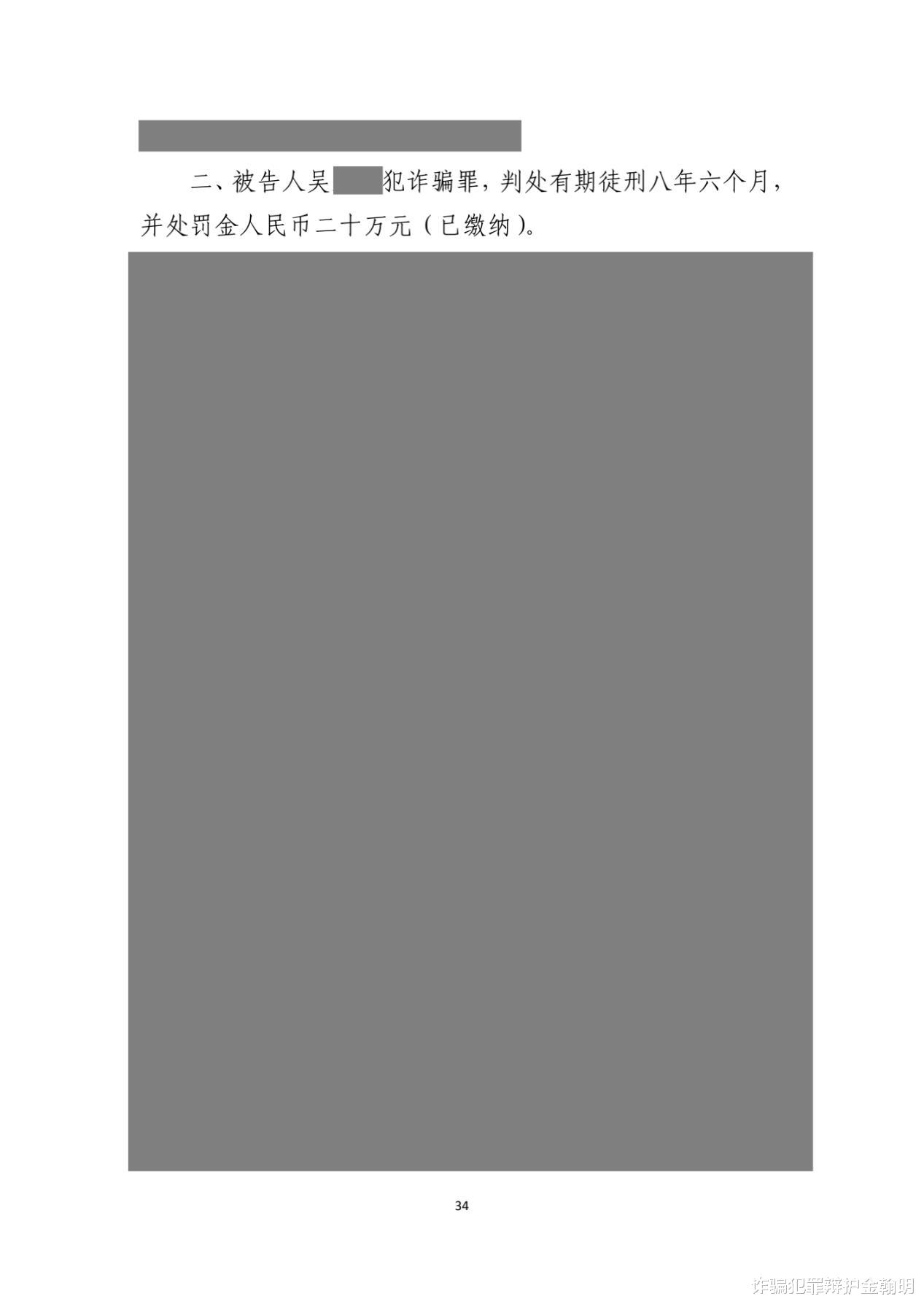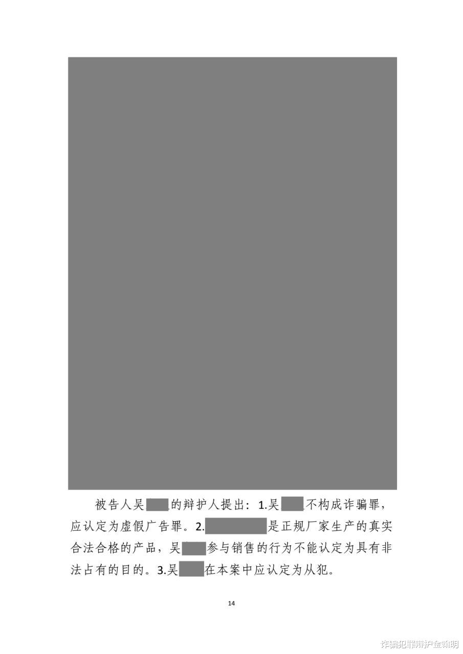 本案是一起公安部督办、中央电视台报道的特大保健品诈骗案,全案涉案金额超过八亿。我们一审阶段介入案件,认为《起诉书》指控吴某构成诈骗罪系定性错误,本案应成立虚假广告罪,同时为吴某做从犯辩护等量刑争取。由于案件牵扯人员众多、影响巨大,法院最终没有变更罪名,但采纳了辩护人从犯的辩护意见,对当事人减轻处罚,当事人从建议量刑十三年半,到最终判决八年半。