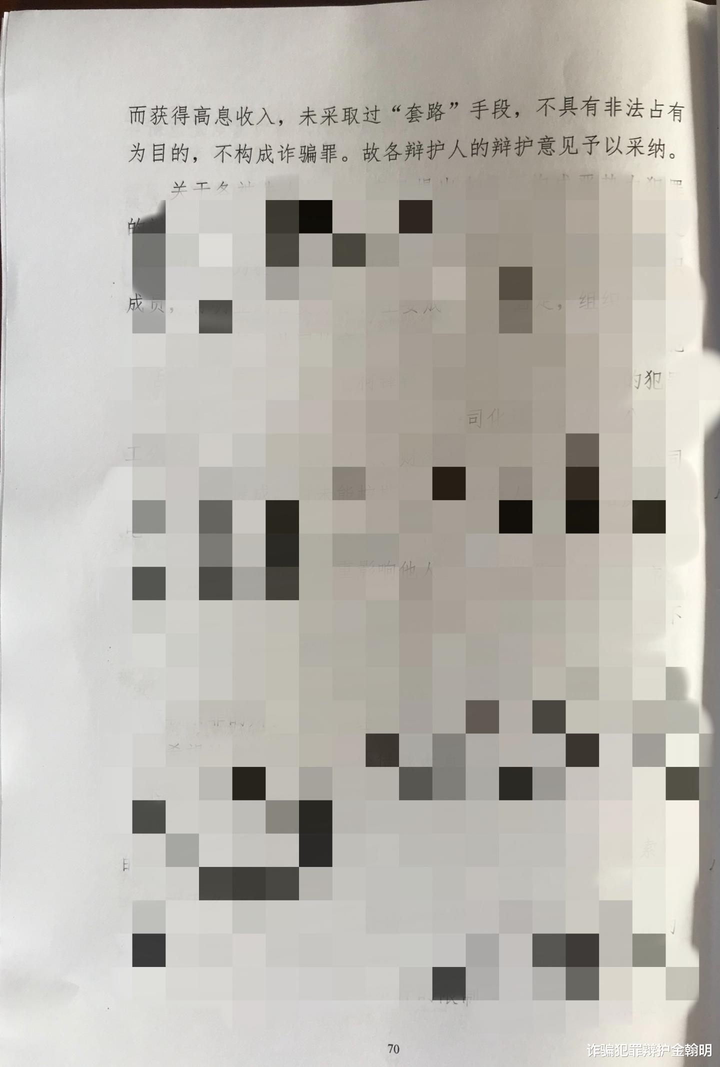 一审阶段介入案件后,我们综合全案事实、证据充分论证涉案人员没有实施诈骗行为,在案的实物证据能够证明借款人没有被骗,本案不能将砍头息等同于诈骗罪。一审开庭中多位辩护人据理力争、据法力争,最终本案经一审法院向上级人民法院请示,判决书中拿掉了诈骗罪、敲诈勒索罪两个罪名,折中选择寻衅滋事罪一罪进行判决,从量刑建议超过十年的有期徒刑,到最终三年多的结果。