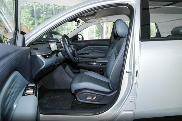 来看座舱内部,新车采用了观感简洁大方的内饰布局,实拍车型采用白灰相间的撞色设计,靠近前排乘客的门板、副仪表台、中控台等局部均采用了软性面料的包覆,虽然触感偏生硬,但观感并不廉价。此外,和主流的座舱布局一致,前排采用T字型环抱设计,副仪表台下方预留储物格,便于前排乘客携带零碎物品。
