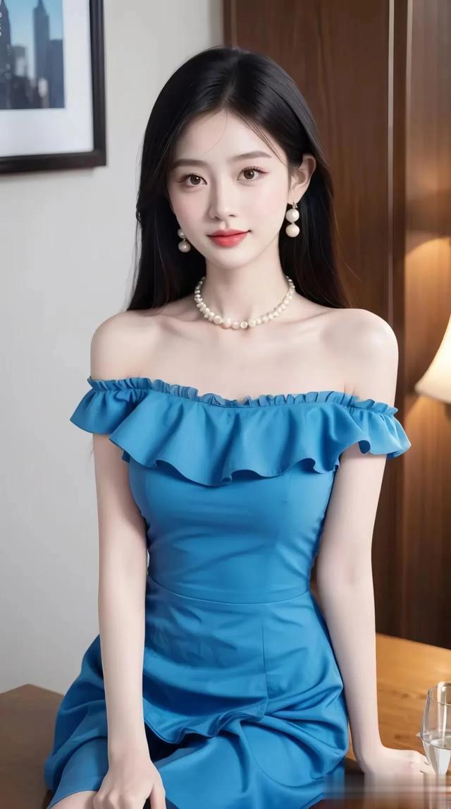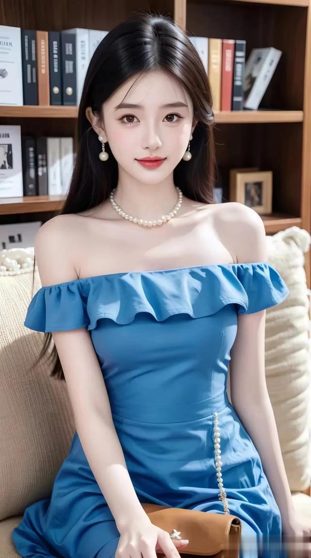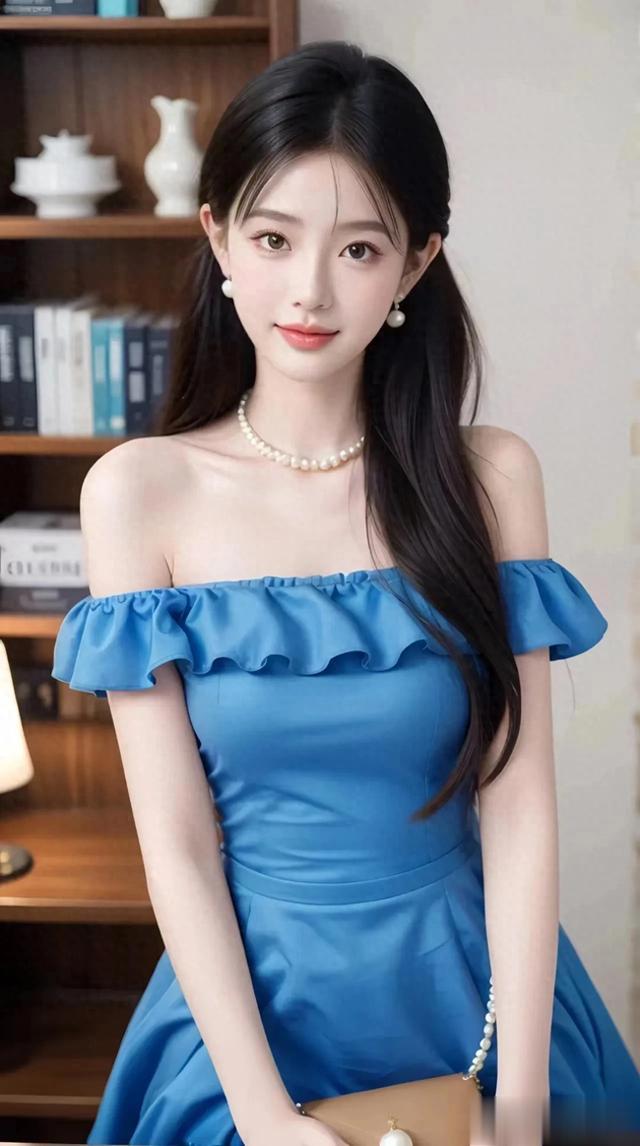 甜系美女壁纸‖ 清新优雅的蓝色连衣裙,珍珠配饰,完美搭配~