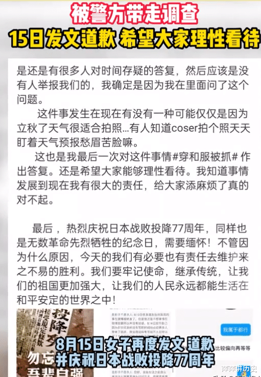 12月27日,随着贵州女子穿和服逛街引发了激烈的舆论,也触及了民族情感和文化敏感性的深层话题讨论,女子意识在自己错误,也出来发声道歉了,但是大部分网友还不不买账,觉得不管什么时候,人在追求个性表达时,更加考虑社会责任和民族情感。