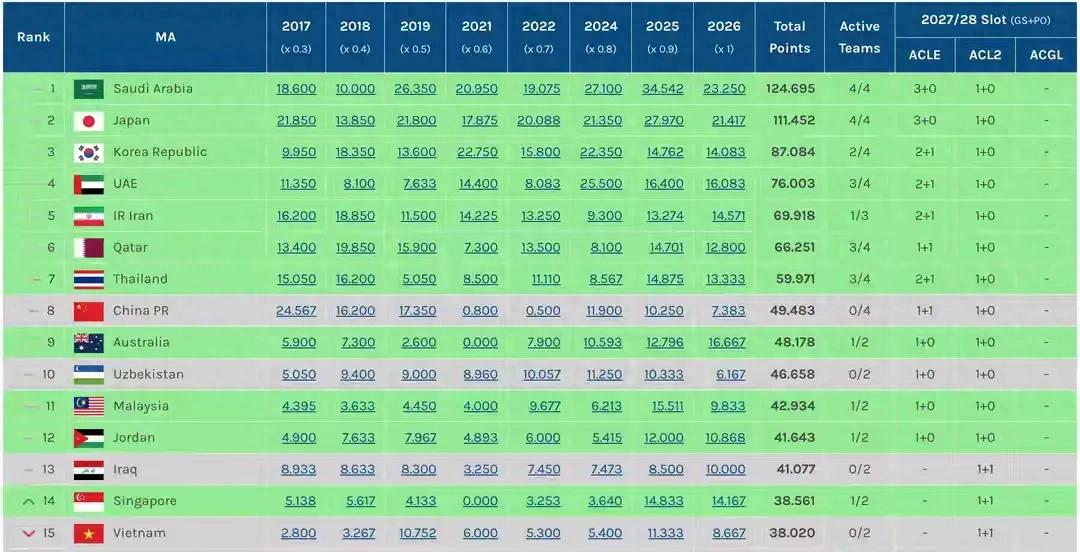 中超三支球队,上海海港4平4负排名倒数第一,上海申花1胜1平6负排名倒数第二,成都蓉城1胜3平4负排名倒数第三。从亚足联公布的最新排名来看,沙特联赛以23.250分排名第一,当之无愧是亚洲第一联赛,日本联赛以21.417分紧接着排名第二,澳大利亚联赛以16.667分排名第三。中超则是7.383分排名亚洲第15位,这个分数还不如越南联赛高,泰国联赛更是比中超高出近6分,足以见得中超联赛水平之差。在东亚区范围内,中超排名第9,只比柬埔寨联赛高出1.3分。