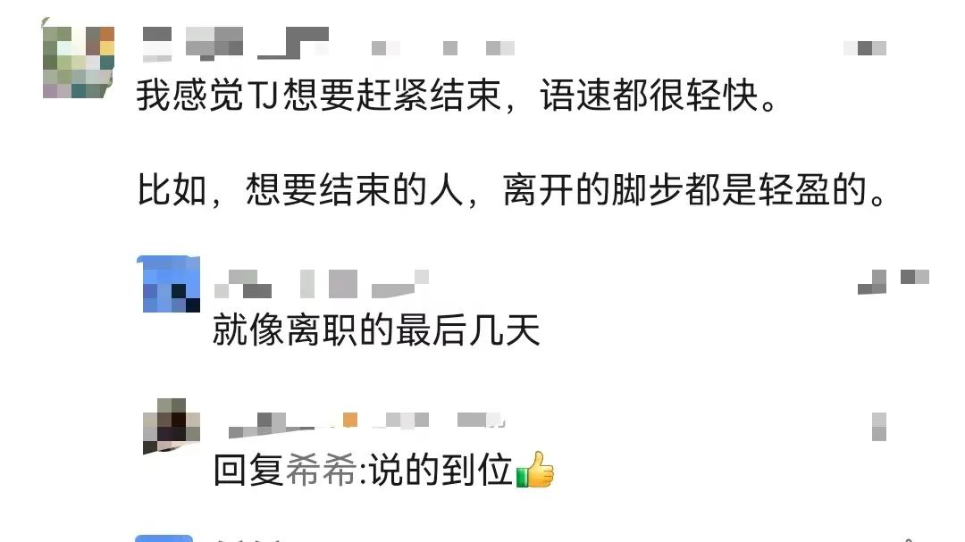 有网友表示,感觉TJ语速很快,只想要赶紧结束话题,就像想要结束的人,离开的脚步都是轻盈的。
