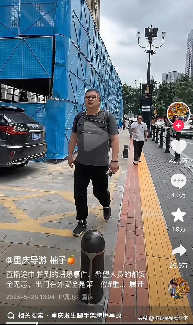 近日一名重庆的美女导游“柚子”,在经过一栋大楼时,猛然发现前方路旁正在施工的脚手架开始倒塌。她迅速反应,快步逃离了现场
