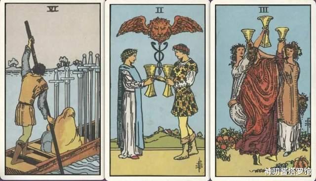牌:宝剑六+ 圣杯二+ 圣杯三+