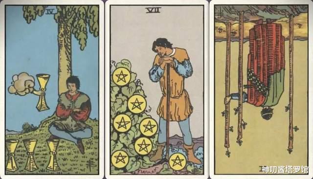 牌:圣杯四+ 星币七+ 权杖三-