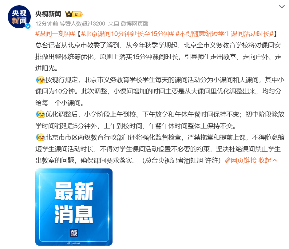 北京义务教育学校将课间 10 分钟延长至 15 分钟,这一举措引发了广泛讨论。