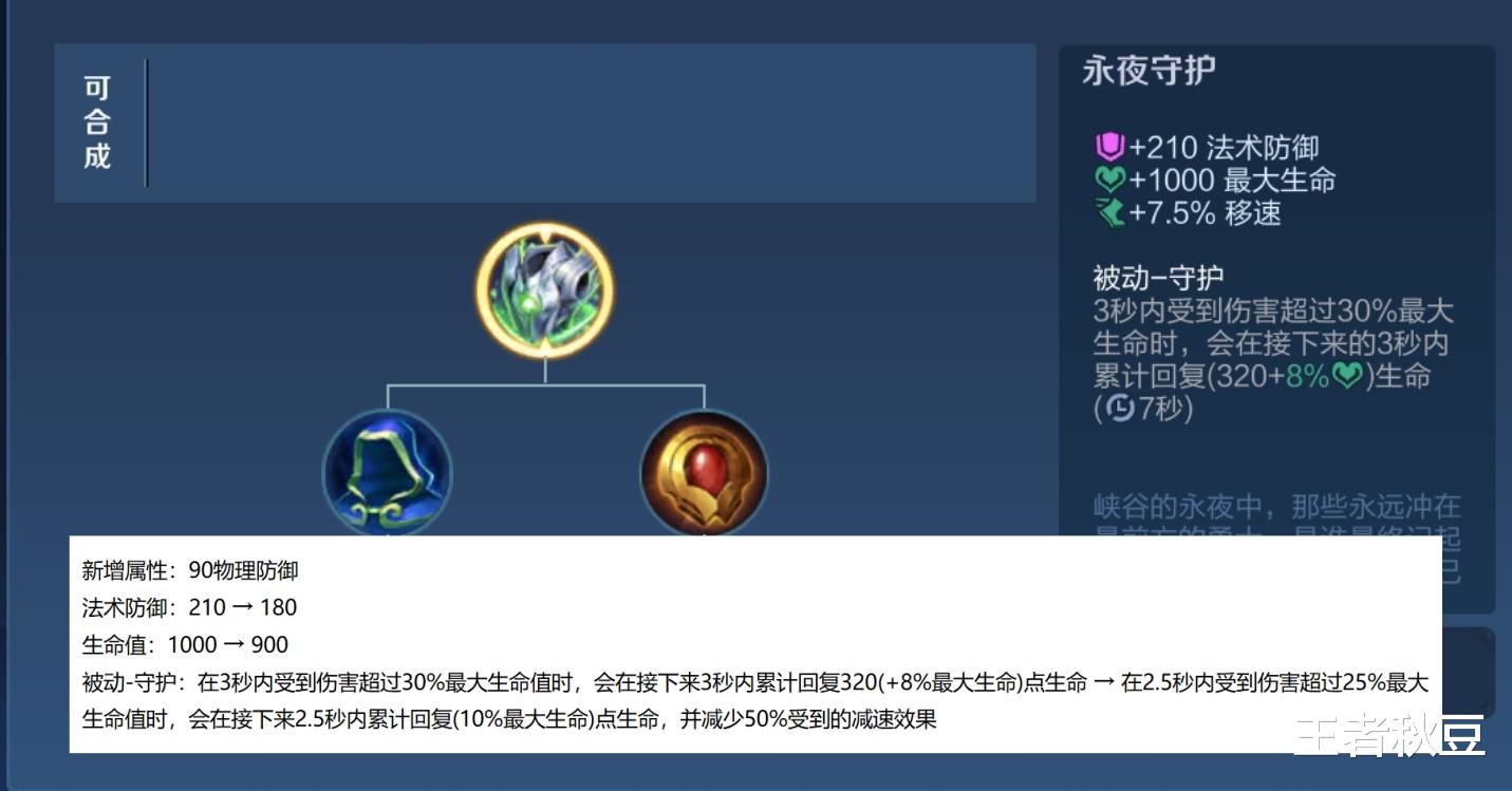 和魔女斗篷、不死鸟之眼一样,永夜守护也新增了物理防御,变成了一件有物理+法术防御的通用装备。作为平衡,法术防御减少30点,生命值减少100点。被动也改成在2.5秒内受到25%伤害就能回复10%最大生命的生命值,并减少50%的减速效果。