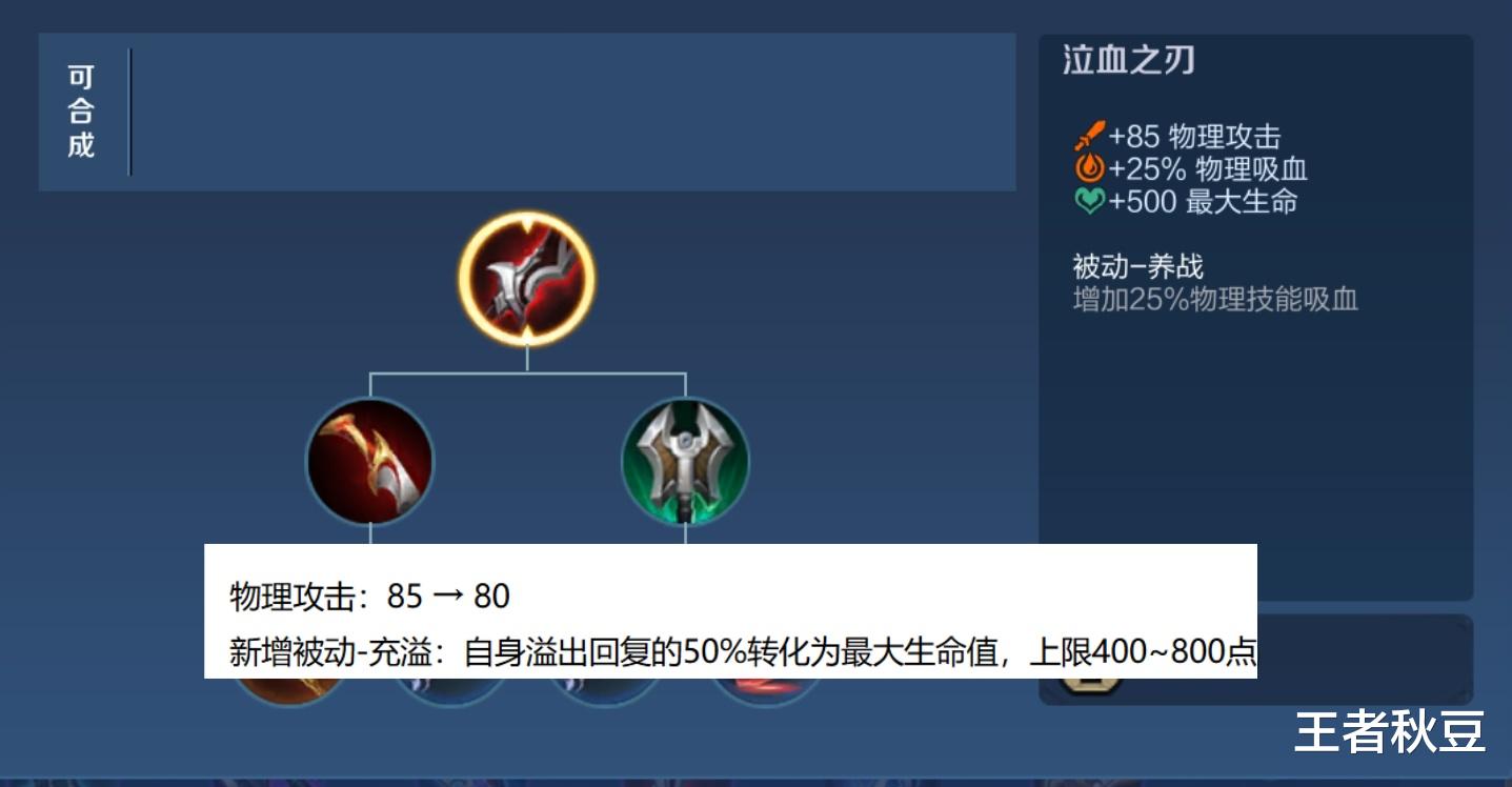 泣血之刃物理攻击减少5点,新增被动溢出回复的50%转化为最大生命值,最高800点。加上原来的500点生命值,一共1300点的生命加成让泣血之刃变成了一件不错的输出防御装,像李白,李元芳这类出泣血之刃的英雄大大加强。