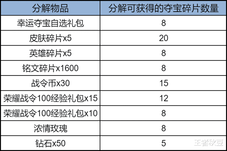 玩家在积分夺宝抽奖后,除了英雄、皮肤和典藏皮肤外,其他的奖励先存入夺宝盒,玩家可以在夺宝盒里选择奖励或者分解和夺宝碎片,类似无双抽奖那样。夺宝碎片可以兑换积分夺宝里的皮肤,如雅典娜-冰冠公主,达摩-拳王等本来在积分夺宝抽奖里的皮肤。具体可分解物品和数量如下: