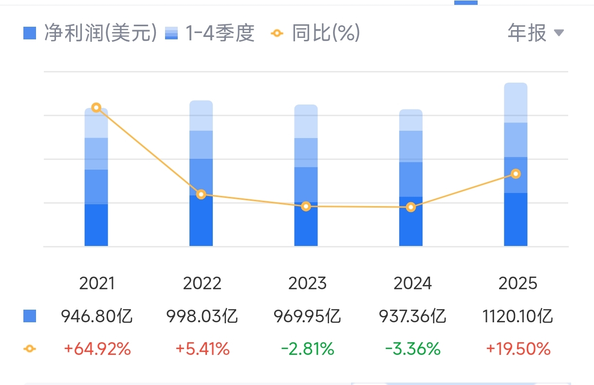2025年,1120.10亿美元(这也是苹果公司净利润首次突破1000亿美元)