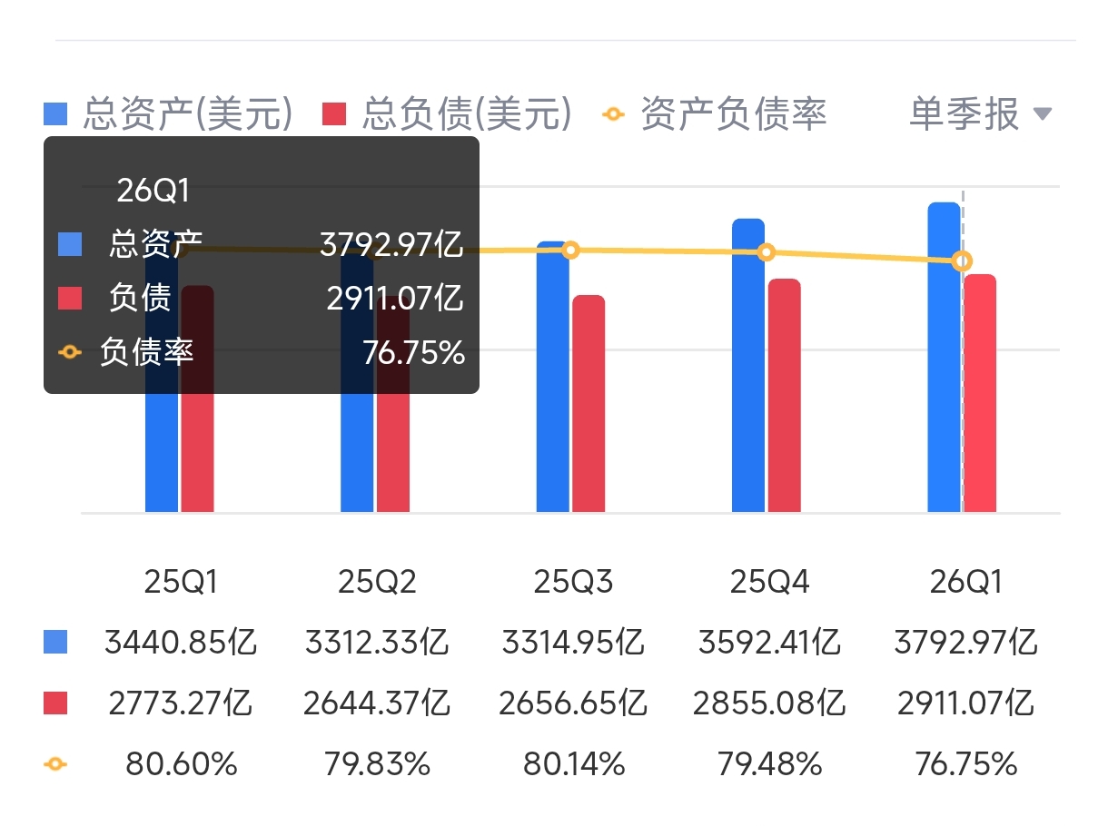 资产总额3793亿美元,比上个季度末增加201亿美元,增幅5.58%。