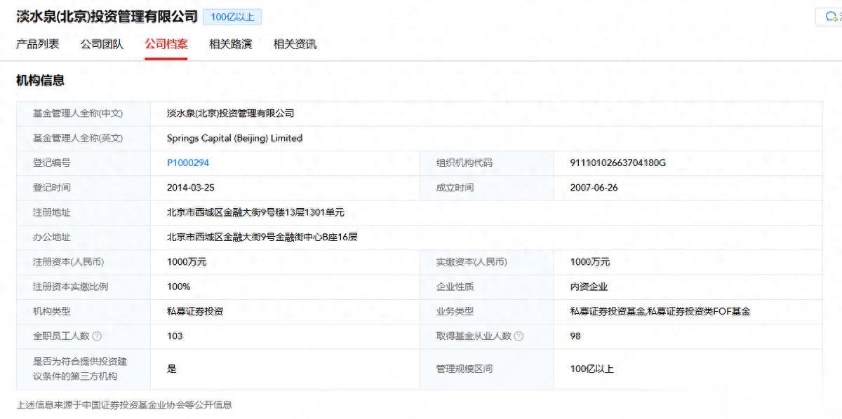 百亿私募淡水泉最新动向淡水泉是成立于2007年的老牌主观私募,管理规模在100亿元以上,公司以北京为总部,在上海、深圳、香港、新加坡和美国设有办公室。