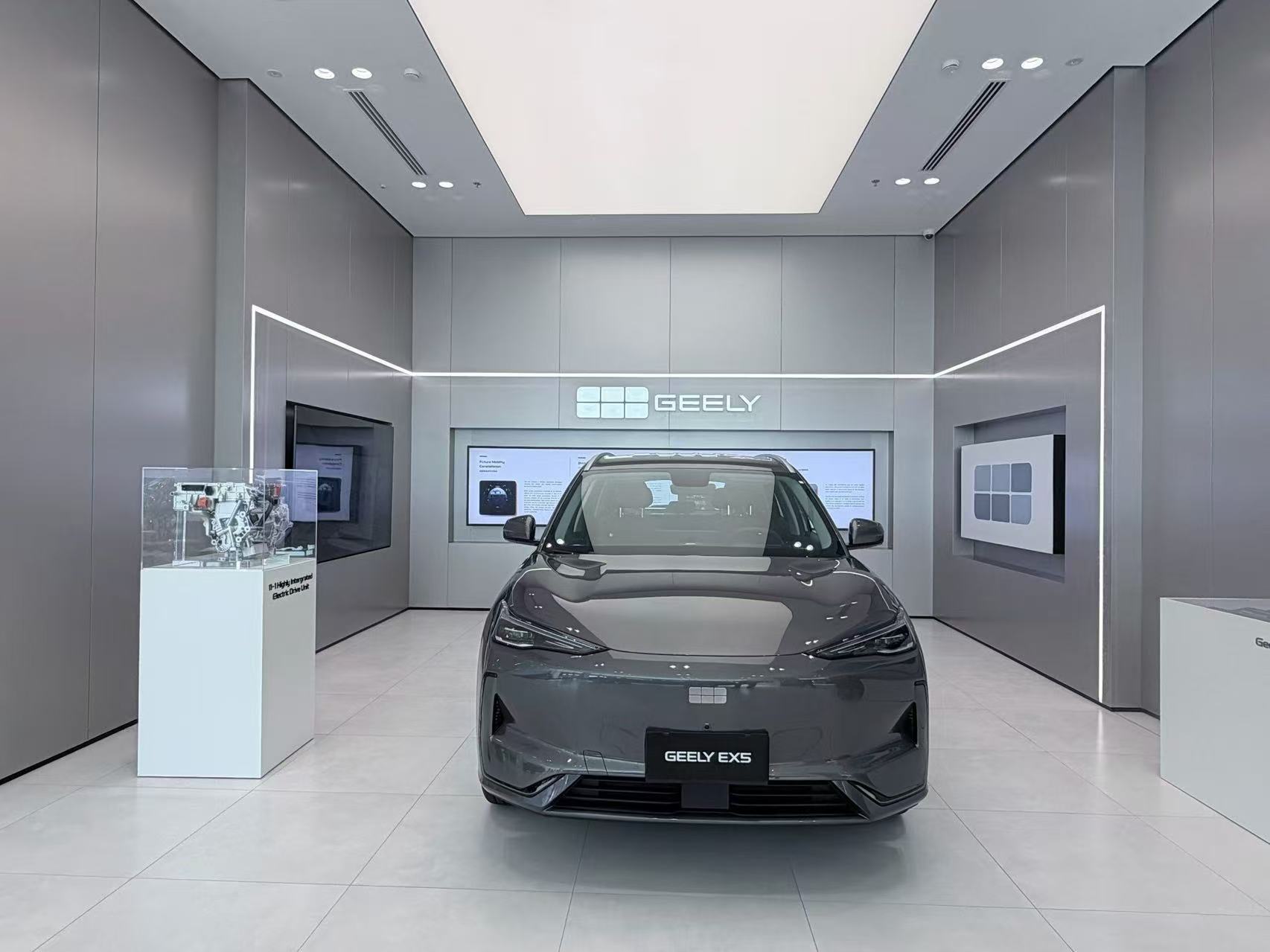 在吉利迪拜AGMC展厅,分布了两块区域,在展厅的右手边,就是新能源汽车的展示区,虽然目前只有吉利新能源EX5一款车,但却是最有竞争力的国内热销车型吉利银河E5。