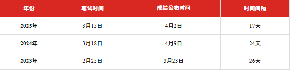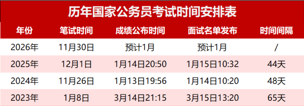 👉往年参考:去年国考跟今年的国考笔试时间相隔1天,参考往年笔试与成绩发布的时间间隔,基本在40+天。