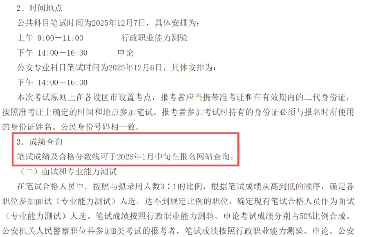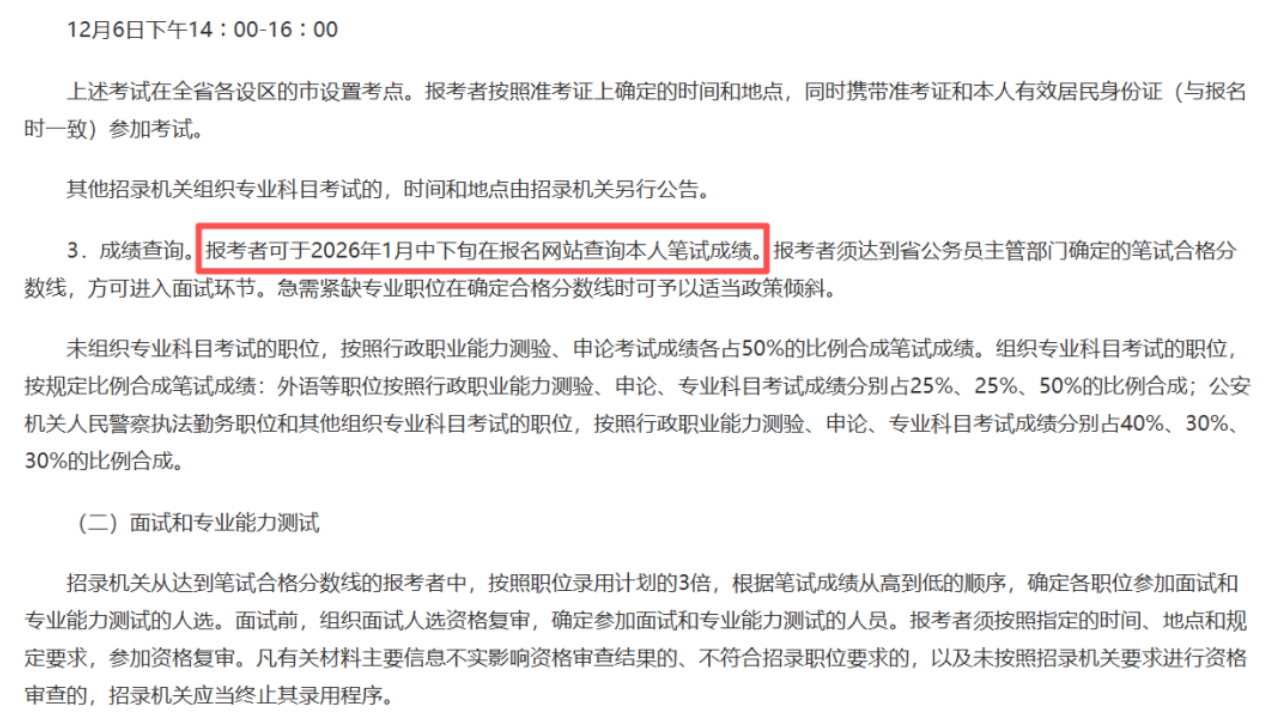 2026山东省考公告中说明:报考者可于2026年1月中下旬在报名网站查询本人笔试成绩。