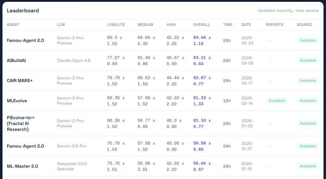 去年 10 月,百度伐谋团队首次向 OpenAI 主导的 MLE-Bench 提交了 Famou Agent 的成绩,以 43.56 分拿下当时的 SOTA(最优水平)。在此之前,这个硬核的机器学习工程榜单提交者寥寥,伐谋的登顶瞬间让榜单热闹了起来,陆续吸引了近 10 家顶尖团队入场角逐。