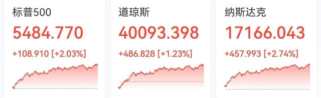 周三晚间,美三大股指上涨,纳斯达克+2.74%,标普+2.03%,道琼斯+1.23%。