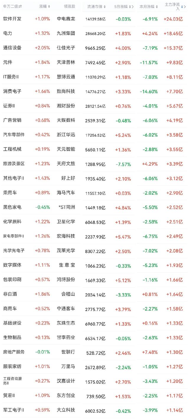 热点中的信安(软件、IT服务)、通信设备和元件、消费电子和光学光电子、证券、AI应用(广告营销、数字媒体)、军工电子、其它电子等,传统产业的电力、汽车零部件和家电零部件、工程机械和基建、工程咨询、旅游、饮料、黑色家电、商用车、医药生物、房地产服务、服装、贸易等板块净买入较大。