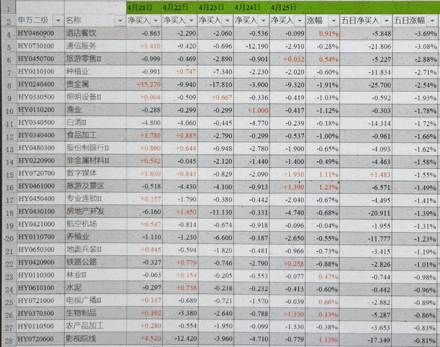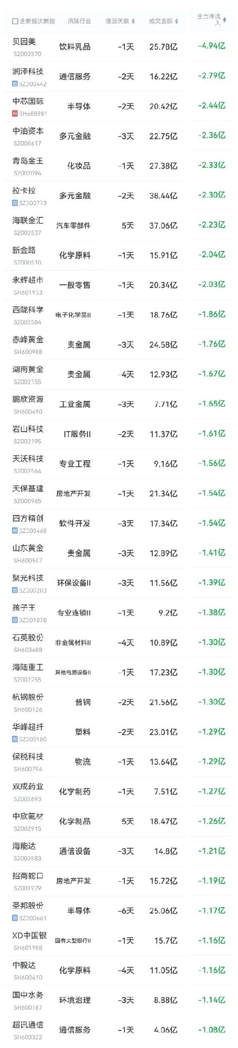 传统产业的医药和医疗器械、中药、化工、饮料乳品、房地产、商贸零售、电信服务、新材料、农业养殖业、国有大行和股份制银行、电网设备、专业工程、环保等,热点的半导体芯片、智能制造(通用和专用设备)、国防军工(航空装备)、信安(计算机)等净卖出居前。
