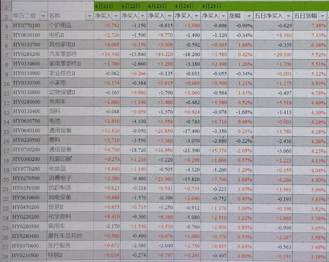 五日连续净买入较大板块有汽车零部件、电力、电机、工程机械、消费电子等。