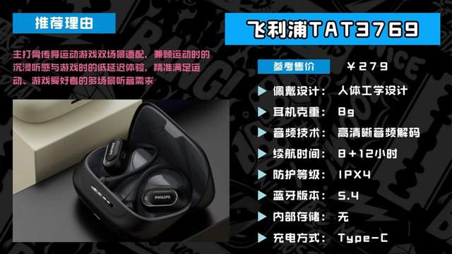 飞利浦TAT3769主打骨传导运动游戏双场景适配,兼顾运动时的沉浸听感与游戏时的低延迟体验,精准满足运动、游戏爱好者的多场景听音需求。