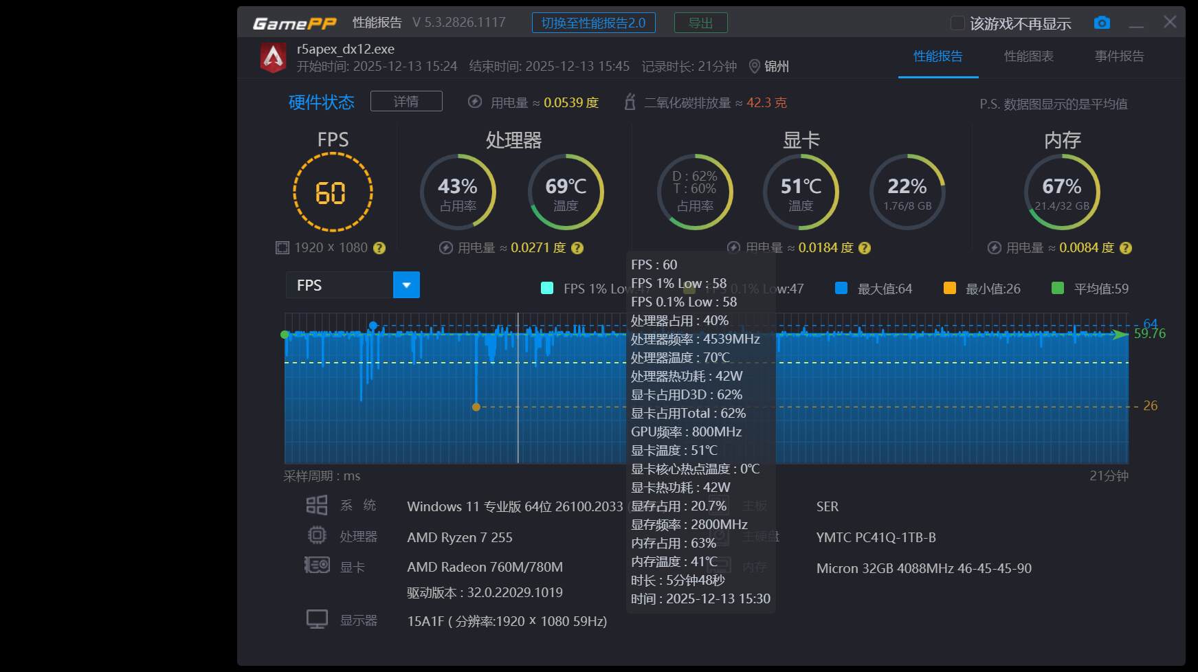 游戏实测,1080P低画质下,永劫无间平均帧率为53FPS,APEX英雄平均帧率60FPS,黑神话悟空平均帧率61FPS,在CS2的游戏体验当中,也是相当的丝滑流畅,如果对于帧率表现要求不是太高的话,现在的迷你主机其实也是完全可以胜任中大型游戏的。