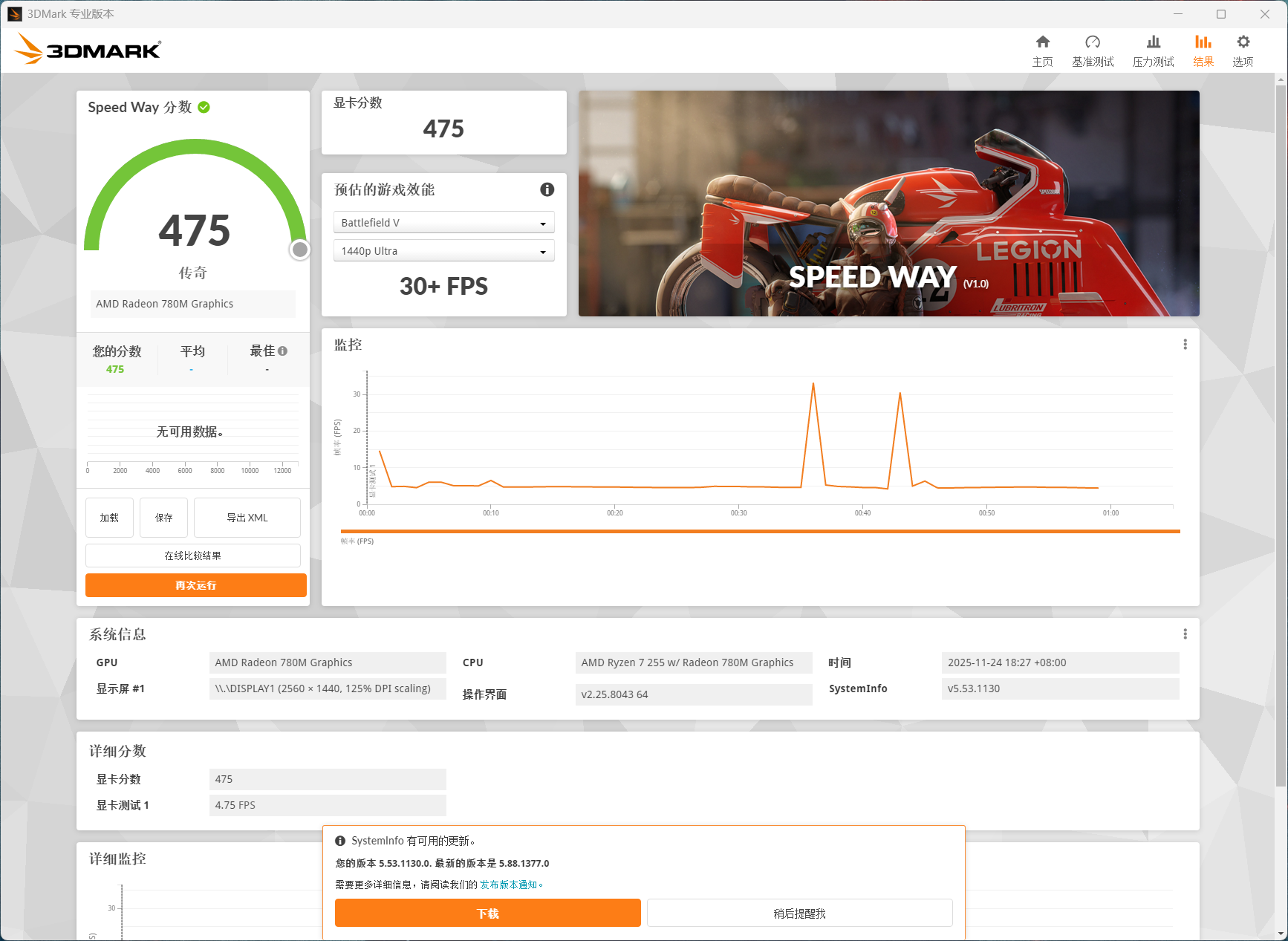 跑分缓解,65瓦性能模式下,鲁大师129万,CineBench R23单核跑分1707,多核跑分16458,3DMARK Speed Way 475,Time Spy 3292,Fire Strike 7985,PCMARK10综合得分6746。