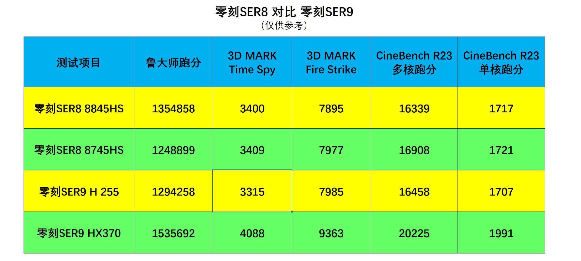 那为了便于大家了解零刻SER系列这几代的跑分对比,我把跑分列在表里了,感兴趣的朋友可以对比参考下性能。