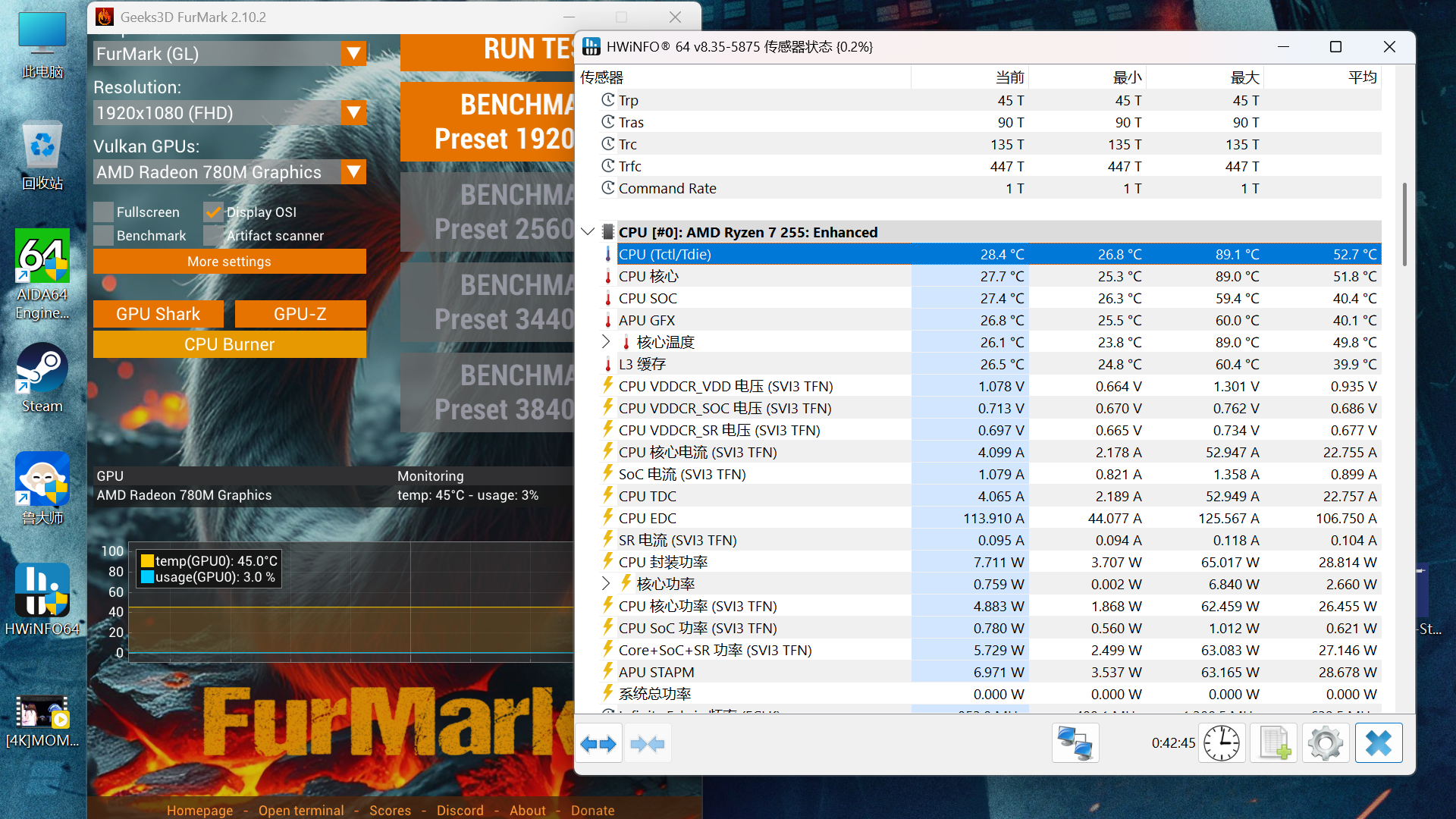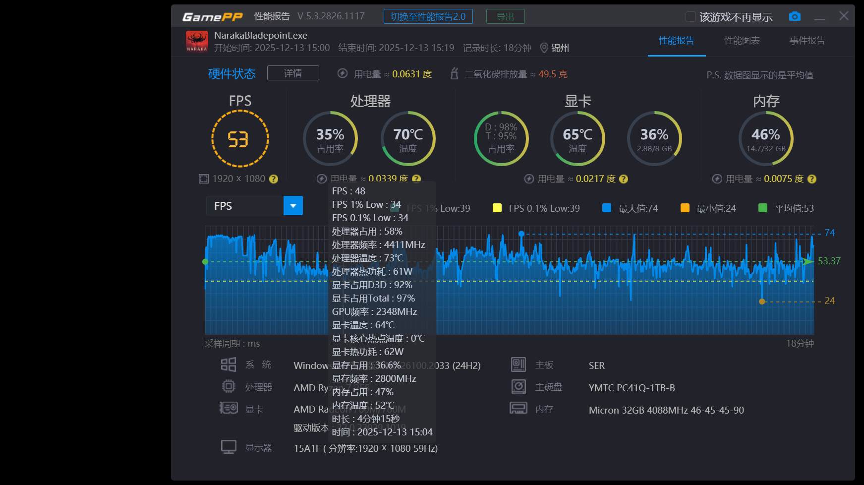 烤机半小时,CPU最高温度89℃,平均温度52.7℃,最夸张的是内存条和硬盘,内存条最高37℃,硬盘最高才30℃,我都不敢信这是高负载情况下的数据。