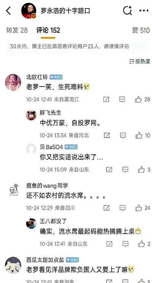 就在新人孤立无援的时候,刚跟预制菜掰扯过的罗永浩站出来了。10 月 24 号,他直接转发事件报道,说要联系当事新人,这条转发一下冲上热搜。要知道,罗永浩上个月才跟西贝因为预制菜吵过架,当时就放话 “不反对预制菜,但不标注就是欺骗”,这回显然是看不惯酒店的霸道行径。