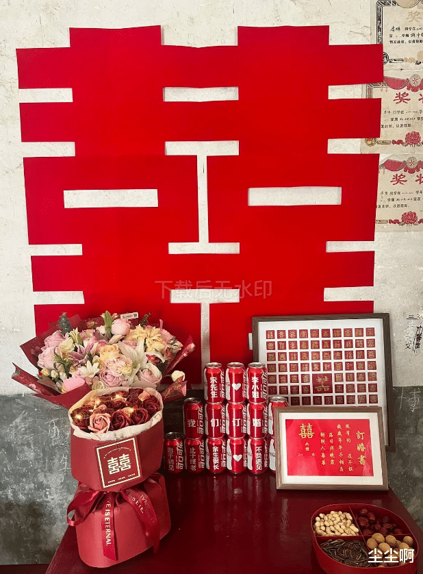 家里卫生收拾好,我在网上买了一个大喜字贴在墙上,还有我自己写的百喜图摆在爸爸刷的红油漆大板桌上,买了一组订制的带字可乐,就简单带了一点氛围感,看着也挺不错的。