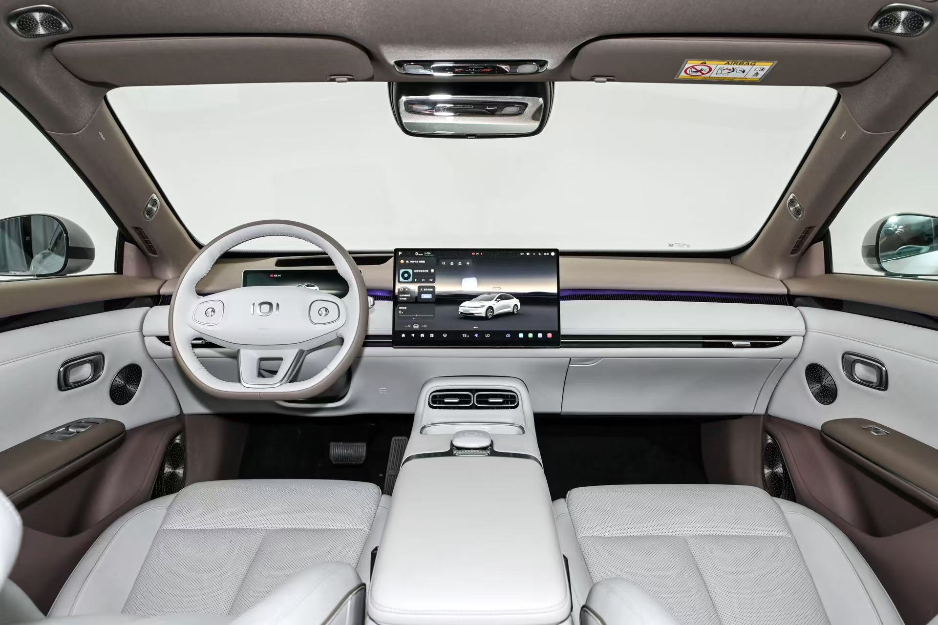 内饰提供棕/白、紫/白两种双色搭配。座舱配备15.6英寸悬浮式中控大屏、12.3英寸全液晶仪表及大尺寸HUD抬头显示,形成三屏联动,中控屏下方保留拓展磁吸实体按键,支持自定义功能。车内中控台、门板及座椅等处采用Nappa真皮与软质搪塑等亲肤材质包覆,方向盘为真皮包裹的三辐式设计。座椅采用零重力云感设计,后排支持145°调节,配备通风、加热及28点按摩功能,搭配1.8㎡全景天幕与电动遮阳帘,车内设有镂空副仪表台、双50W无线快充板及128色环绕式氛围灯。