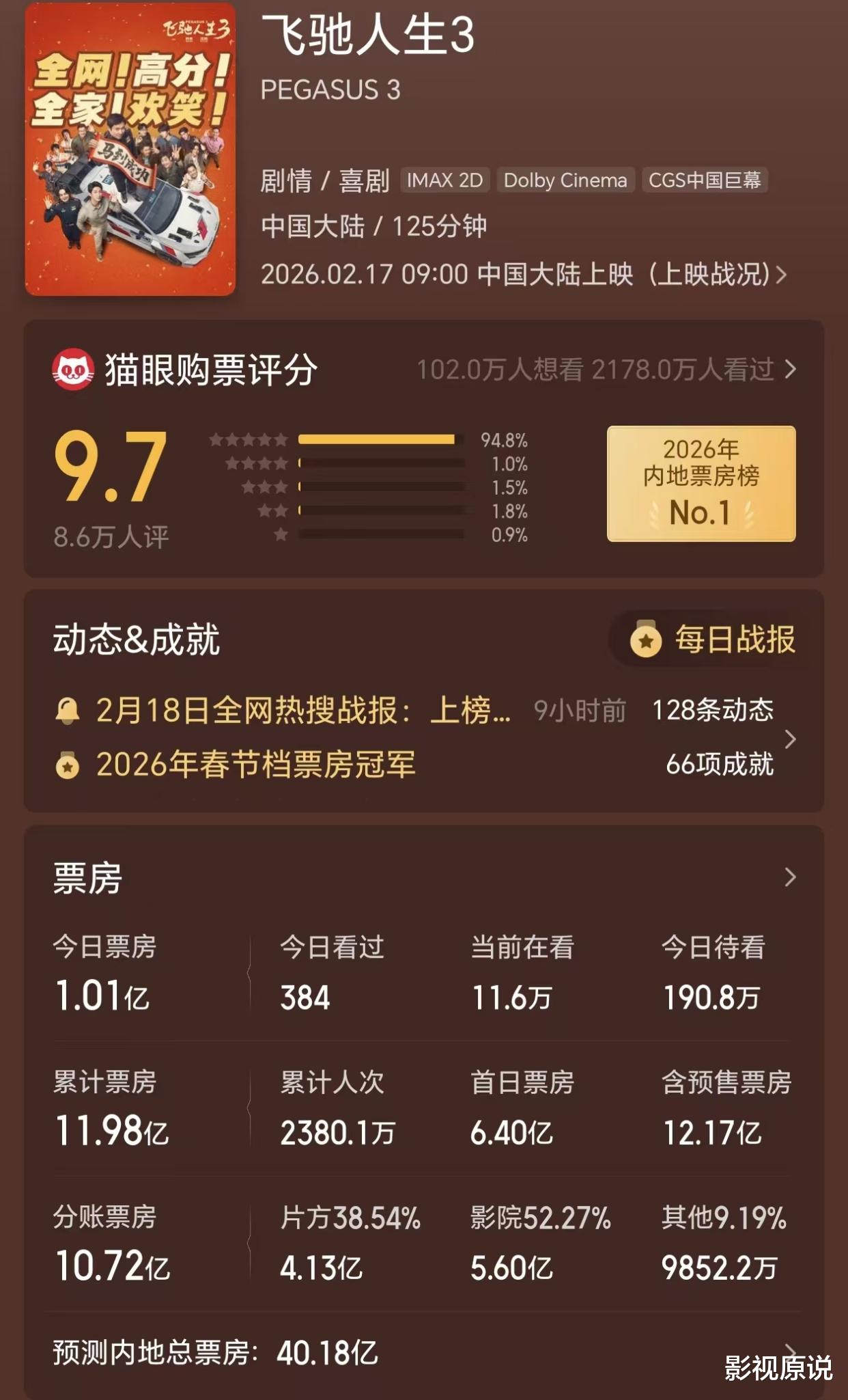 因为首日开画成绩非常出色,且观众们的口碑也很好,不少人都称其为中国版的《F1:狂飙飞车》,所以国内的电影平台预测《飞驰人生3》的最终票房将会突破50亿人民币。