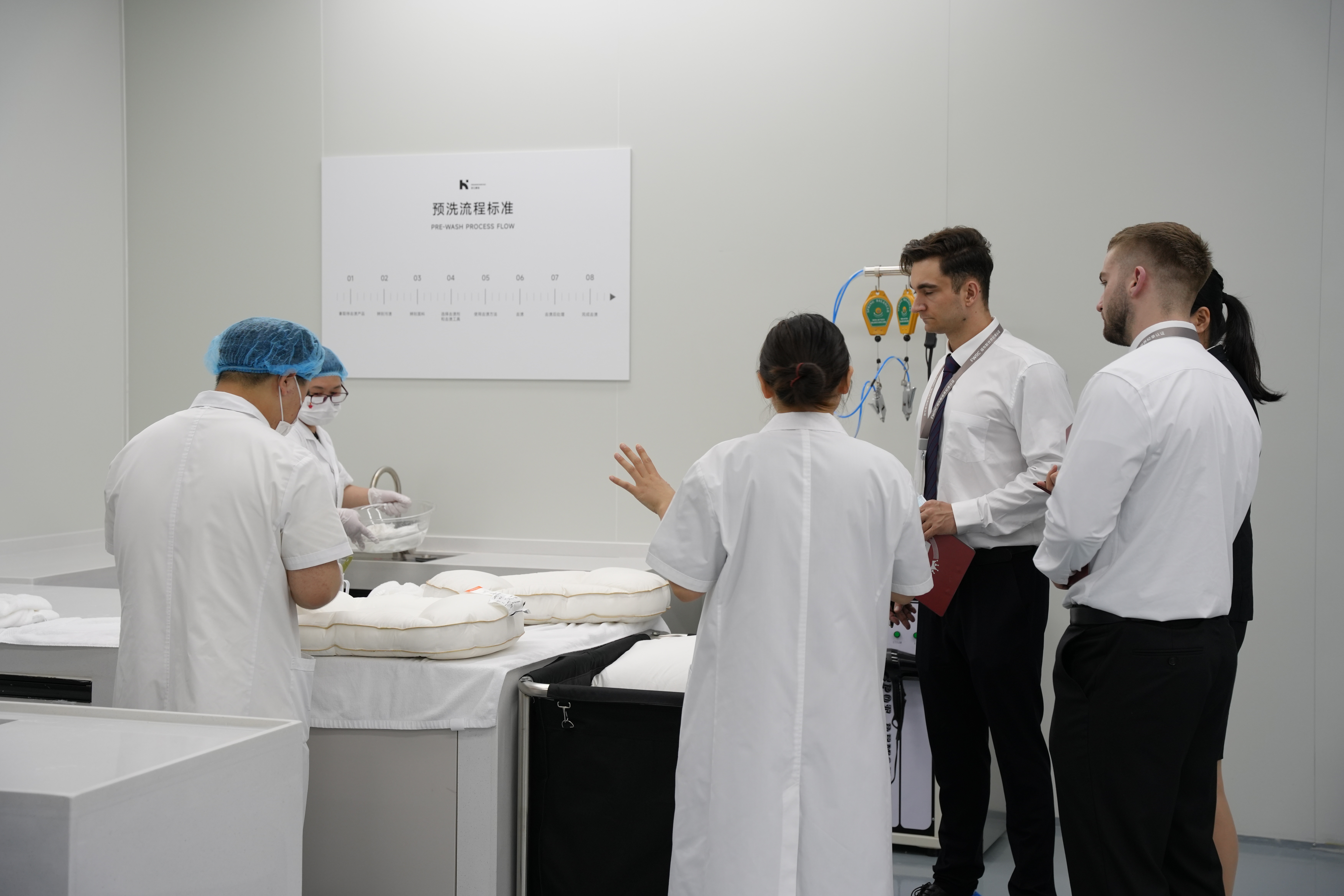 与传统单一的产品检测不同,本次认证更像一场全面的溯源之旅。认证官先从羽绒原料的分毛、烘干与储存环节入手,逐步考察到裁剪、缝制、充绒及洗护工序,以验证产品的全链路品质。最后,认证官从仓库随机抽取一床“Air-Lock专利鹅绒被”,裁剪成40×40cm样品并封存。