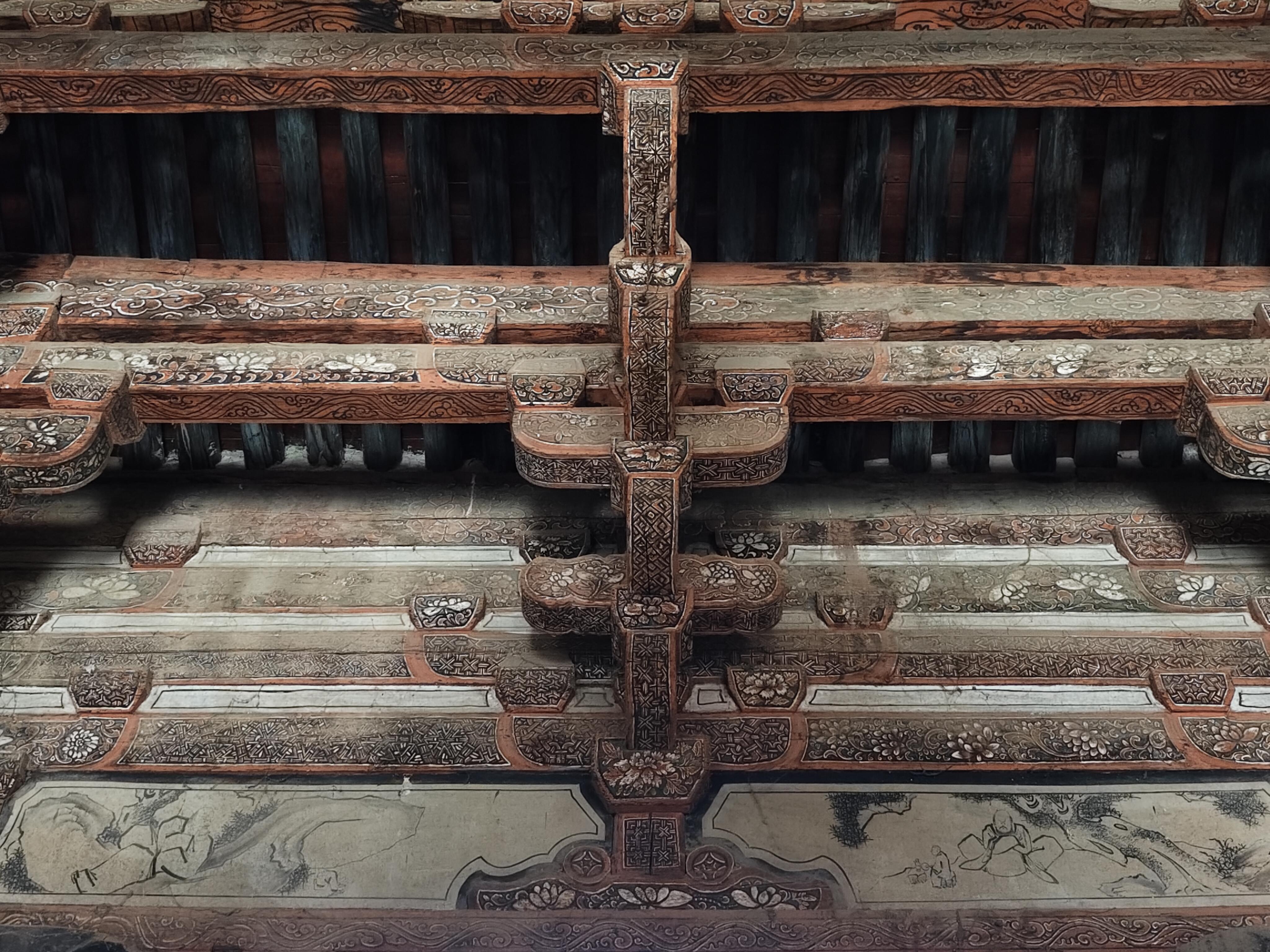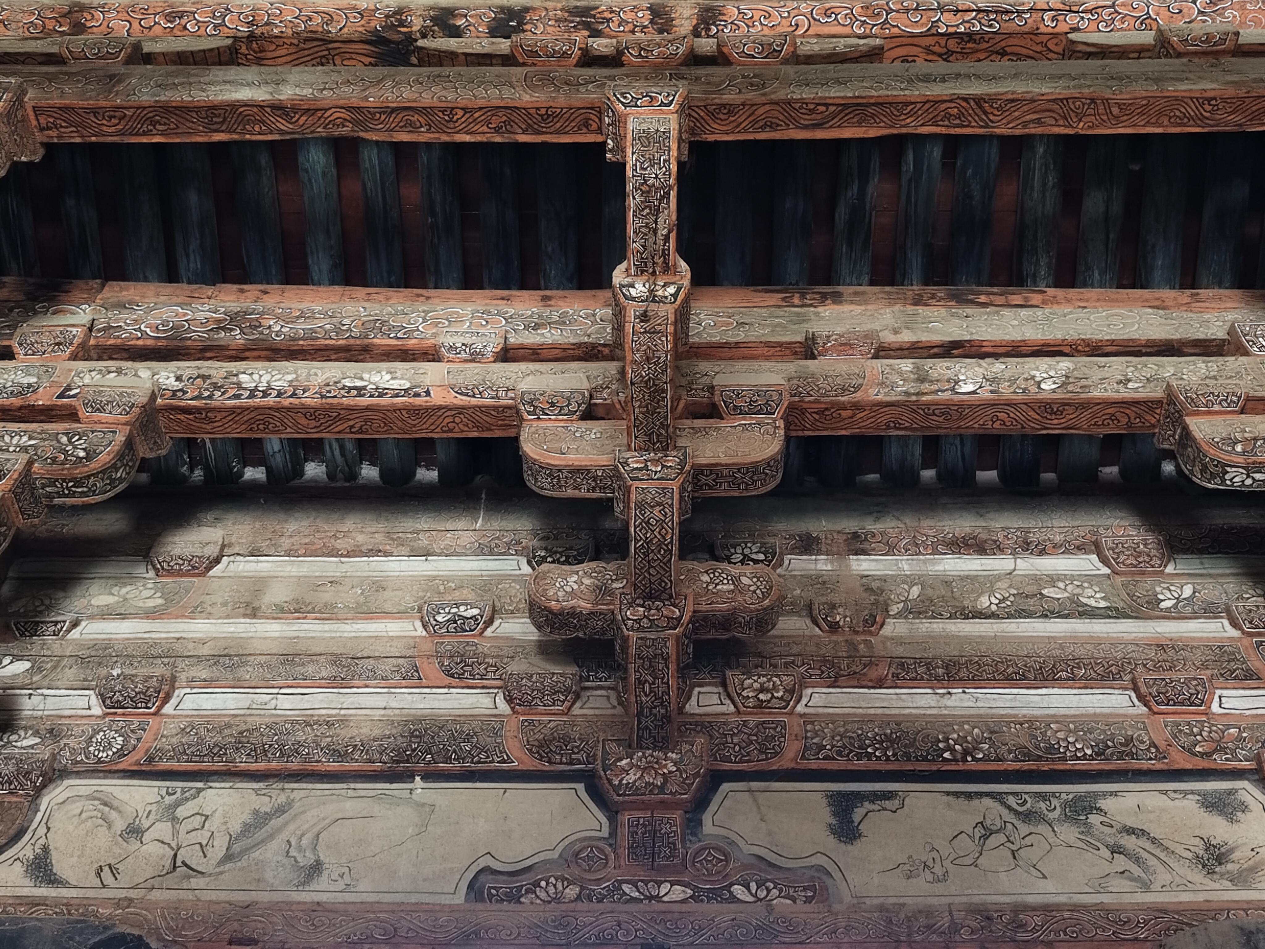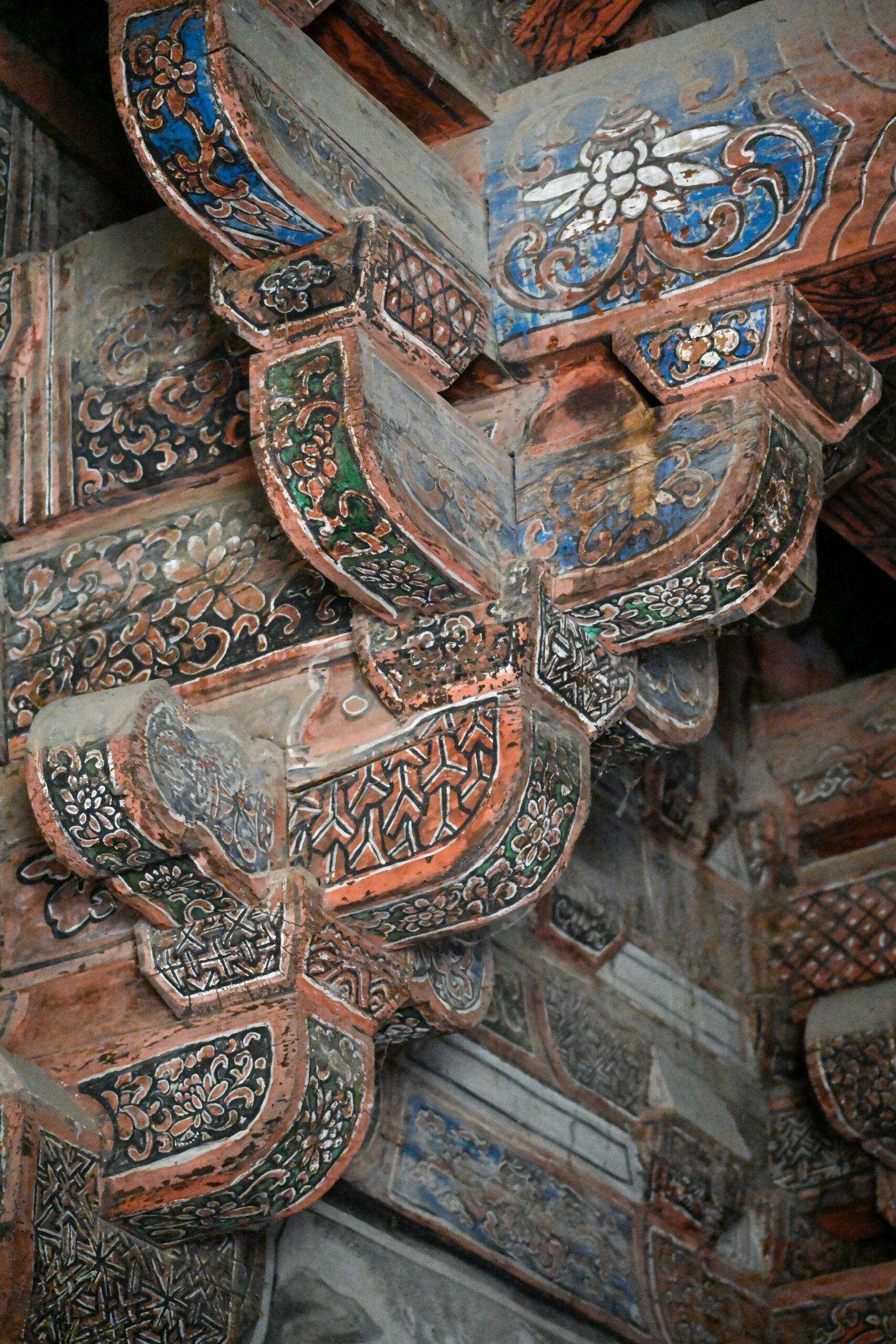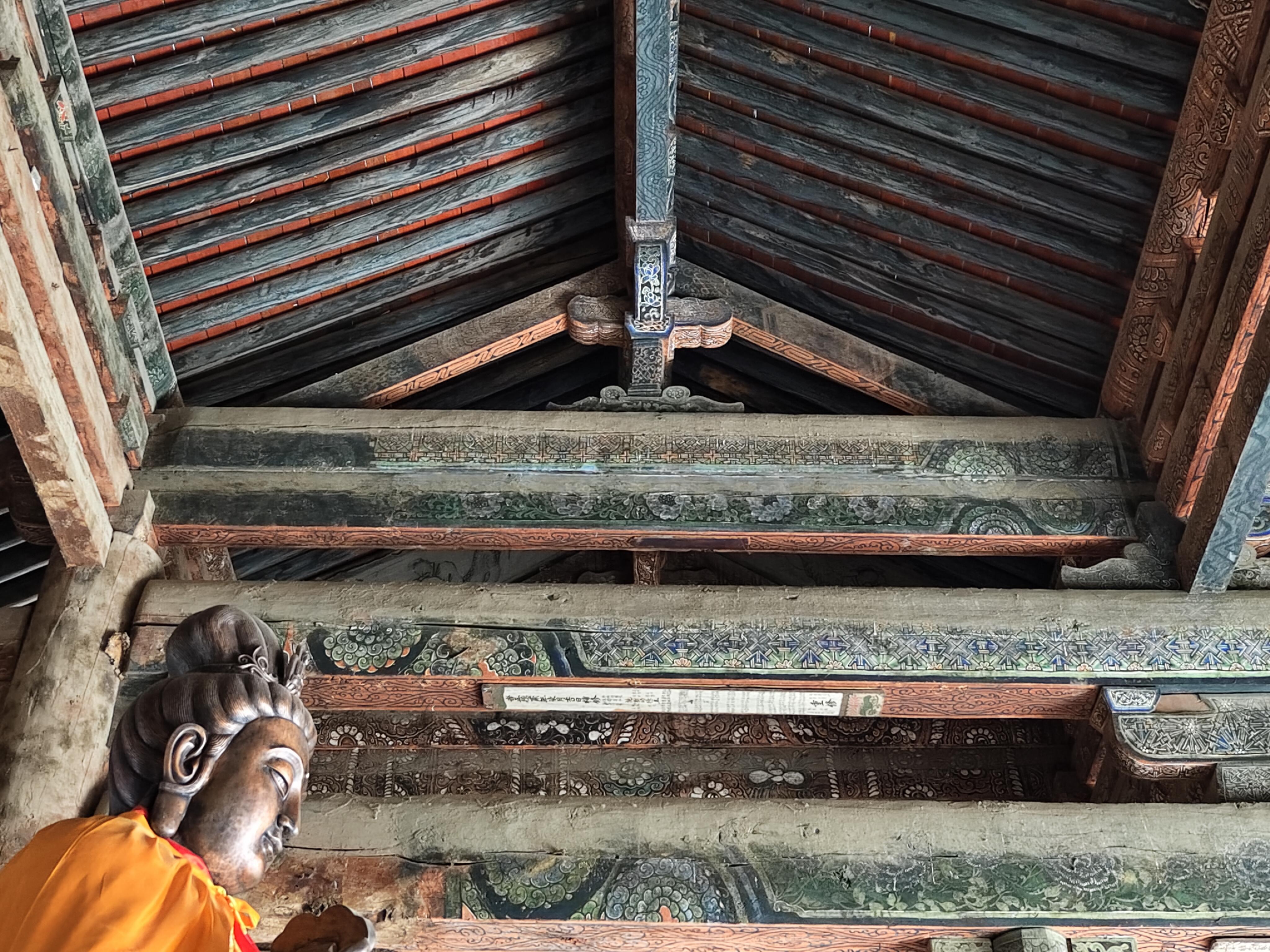 抬手抚摸殿内的立柱,指尖能感受到木材的纹理与岁月的沟壑,而头顶的彩画在昏暗的光线下依旧熠熠生辉。据说,这些彩画在金代、明代都曾经历过修缮重描,但后世的工匠们始终怀着敬畏之心,严格遵循着辽代的原始风格,没有随意改动图案与色彩,才让我们今天有幸看到如此完整的辽代彩绘风貌。这不禁让人想到,在那个没有现代科技的年代,工匠们是如何在高耸的梁架上精准绘制这些复杂图案的?他们又是如何调配出如此稳定持久的矿物质颜料的?每一个疑问的背后,都是古人非凡的技艺与极致的匠心。